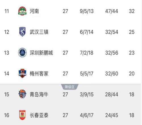 隨著亞泰隊0-2完敗河南隊,中超本賽季的降級熱門球隊基本上已經誕生,就是降級區積18分的海牛隊和亞泰隊。而本輪拿分的深圳新鵬城、武漢三鎮隊,基本上已經提前上岸,稍微比較懸的就是梅州客家隊。他們距離降級區只有2分的優勢。