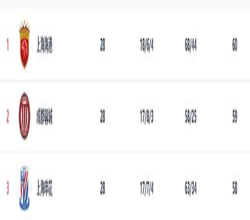 28輪之后,上海海港以60分排名榜首,成都蓉城、上海申花分別以59分、58分排名第2、3位。