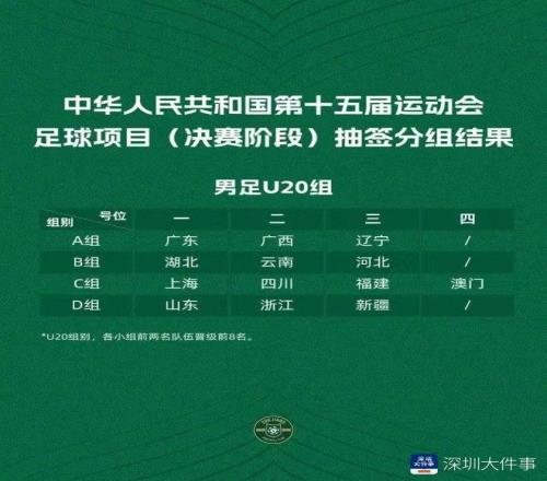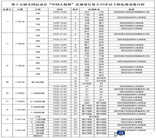 11月1日至12日,本屆全運會男足U20賽事將在深圳賽區進行。比賽共有13支隊伍參賽,分為4個小組,小組賽采用單循環賽制,各小組前兩名進入8強進行淘汰賽,其余隊伍則進行第9-13名排位賽。